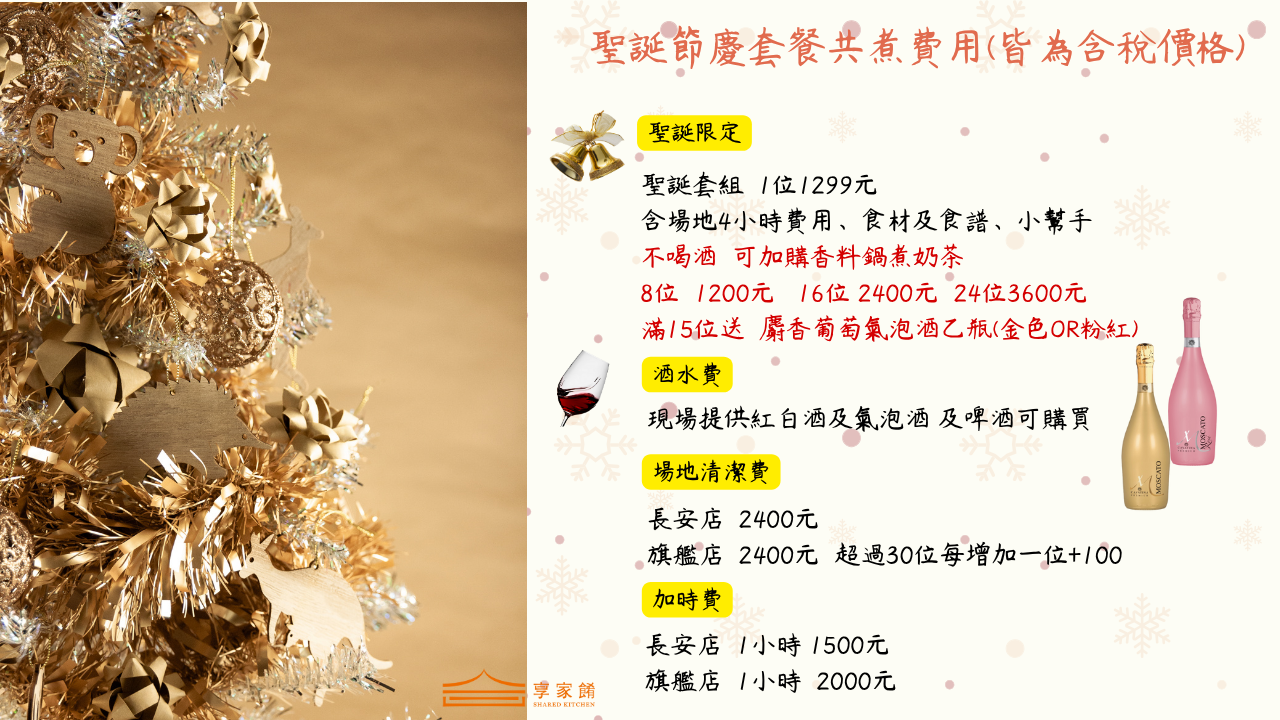 1人1299元(含場地.食材+聖誕共煮套餐(熱紅酒),每場8人起。